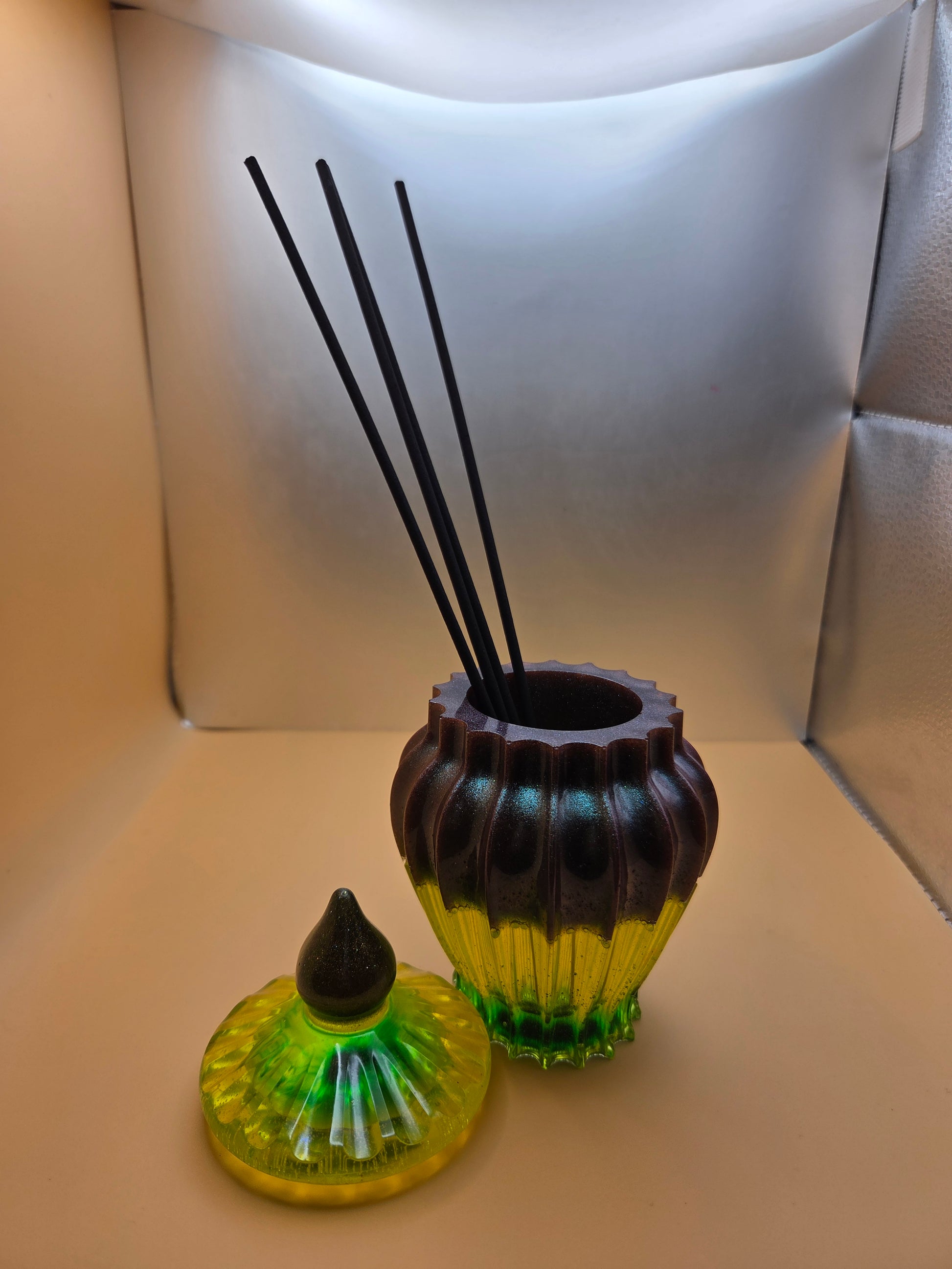 Lime green, forest green, and golds color the vertical ridges and the lid. Its a very earthy and warm piece.